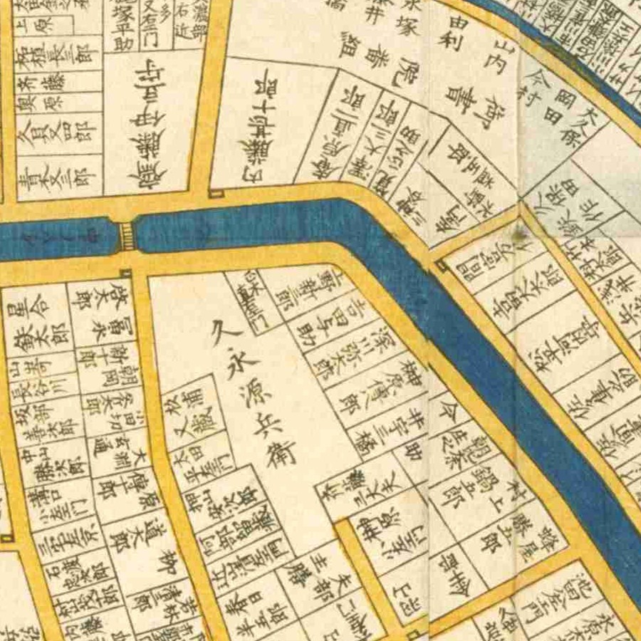 『江戸切絵図』深川/文久2年より抜粋、「村越只次郎」表記区画を成章の屋敷地と推定。家禄は700石 小納戸から先手鉄砲頭に昇進 役職通称遍歴 和暦 西暦 役職 通…