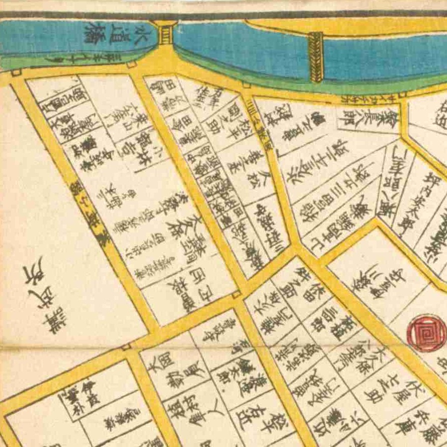 『江戸切絵図』鉄砲洲/嘉永6年(近江屋)より抜粋、「戸川内蔵助」表記区画を安行の屋敷地と推定。戸川道安は実子。家禄は3000石。備中国都宇郡に知行地を有する 本…