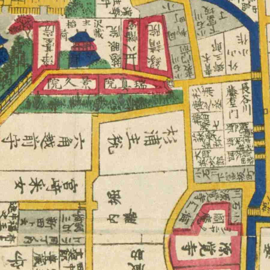 『江戸切絵図』本郷/嘉永2年(近江屋版)より抜粋、「松平傳兵衛」表記区画を乗綱の屋敷地と推定。大給松平家。家禄1200石 湯島に屋敷を構える小納戸 役職通称遍歴…