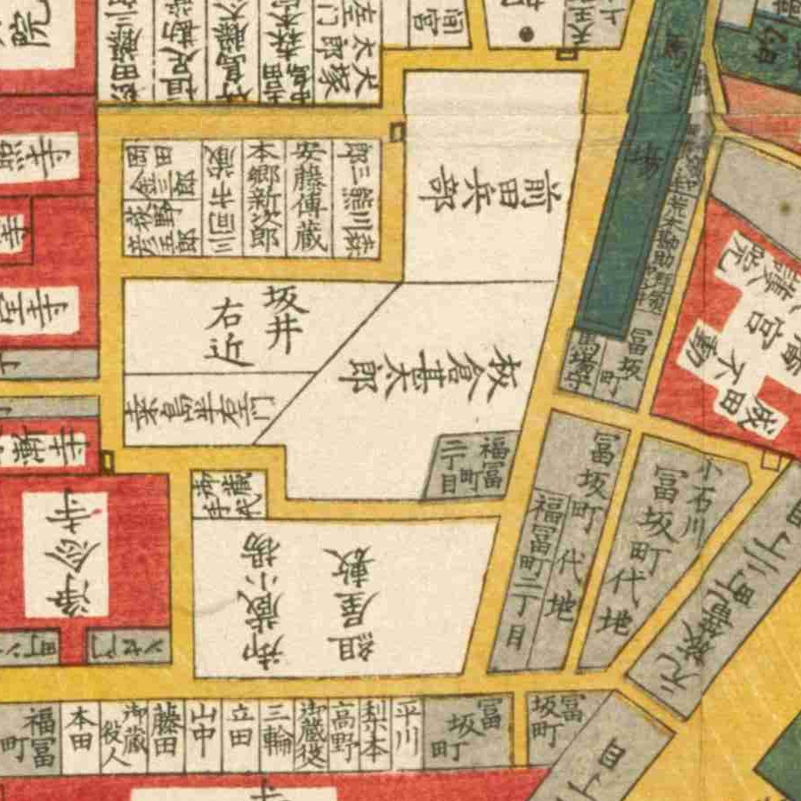 『江戸切絵図』浅草/嘉永6年より抜粋、「板倉甚太郎」表記区画を勝陳の屋敷地と推定。家禄は8000石。山城国綴喜郡、三河国額田郡、幅豆郡、下総国匝嵯郡、海上郡、常陸国新治郡、下野国河内郡、都賀郡に知行地を有する