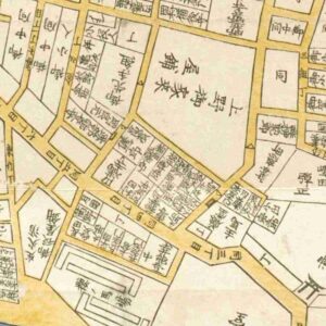 『江戸切絵図』鉄砲洲/文久元年より抜粋、「松下嘉兵エ」表記区画を重光の屋敷地と推定。家禄は3000石。伊豆国田方郡、上総国山邉郡、武射郡、夷隅郡、長柄郡に知行地を有する