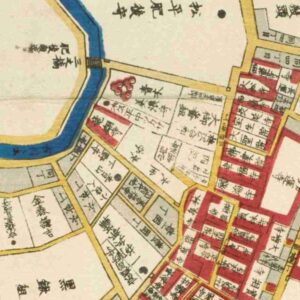 『江戸切絵図』外桜田/元治元年より抜粋委、「松平對馬守」表記区画を正之の屋敷地と推定。大河内松平家。家禄は3500石。三河国幡豆郡に知行地を有する