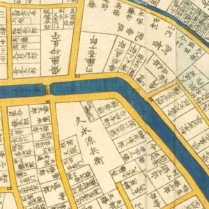 『江戸切絵図』深川/安政5年より抜粋、「大久保肥後守」表記区画を忠学の屋敷地と推定。大久保忠宣は実子。家禄は6000石。駿河国庵原郡、益津郡、武蔵国比企郡、上野国山田郡、下野国足利郡、梁田郡に知行地を有する