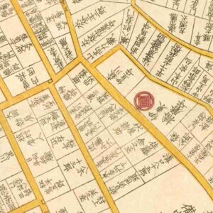 『江戸切絵図』深川/文久2年より抜粋、「大久保四郎左エ門」表記区画を忠宣の屋敷地と推定。大久保忠学は実父。家禄は6000石。駿河国庵原郡、益津郡、武蔵国比企郡、上野国山田郡、下野国足利郡、梁田郡に知行地を有する