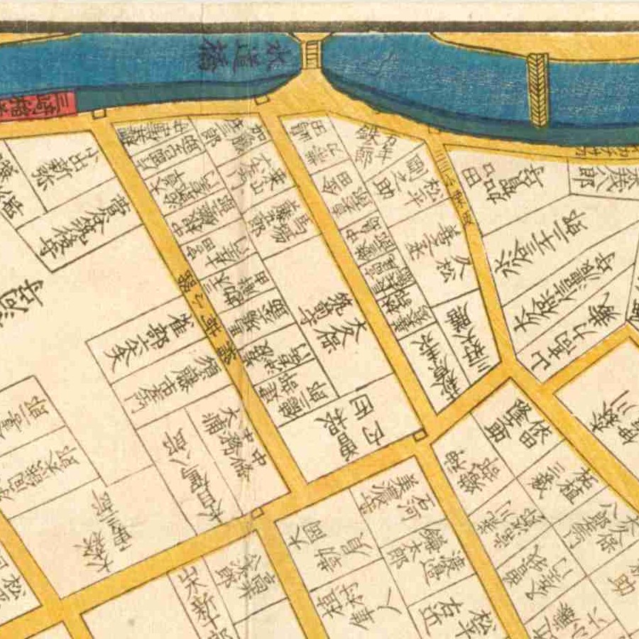 『江戸切絵図』小川町/嘉永3年より抜粋、「大久保筑前守」表記区画を忠恒の屋敷地と推定。大久保忠順は実子。家禄は1900石。同時代に神奈川奉行や作事奉行を務めた家禄1200石の大久保<筑後守>忠恒がいるが別人物