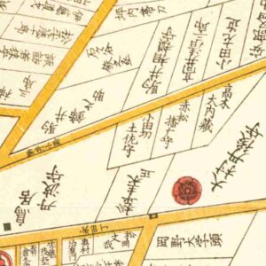 『江戸切絵図』愛宕下/万延2年より抜粋、「大島備後守」表記区画を義彬の屋敷地と推定。家禄は4700石。美濃国賀茂郡、武義郡、摂津国豊嶋郡に知行地を有する