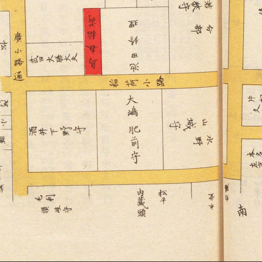 『江戸切絵図』愛宕下/万延2年より抜粋、「大島備後守」表記は義直の実父・大島義彬の表記だが、安政3年に義直が家督を継いでおり、表記は更新漏れと推定。家禄は4700石。美濃国賀茂郡、武義郡、摂津国豊嶋郡に知行地を有する