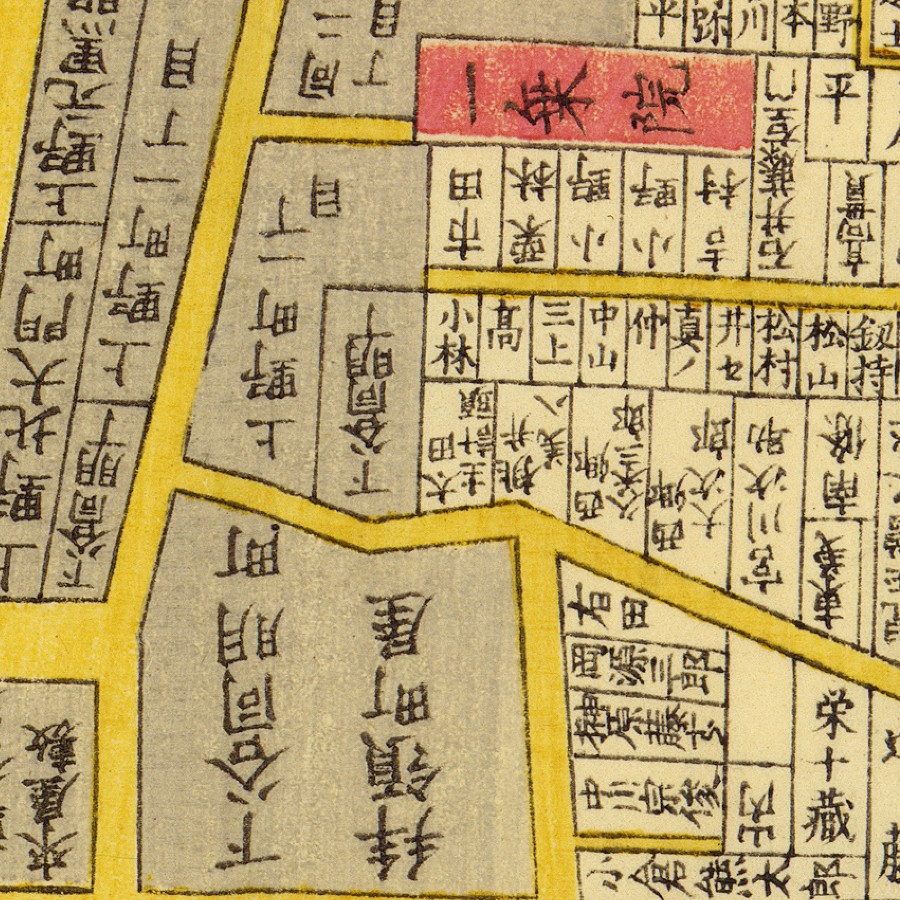 『江戸切絵図』下谷/安政4年(国土地理院蔵)より抜粋、「太田主計頭」表記区画を林幸の屋敷地と推定。家禄は200俵20人扶持