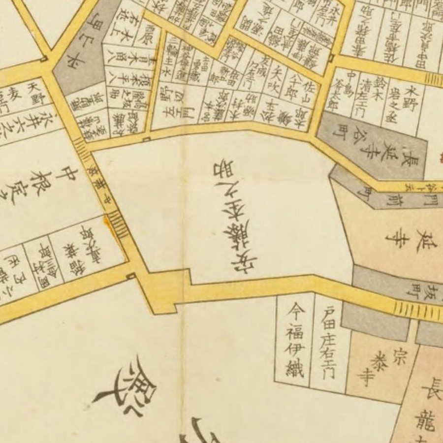『江戸切絵図』市谷/嘉永4年(国会図書館蔵)より抜粋、「安藤杢之助」表記区画を直剛の屋敷地と推定。家禄は4535石。武蔵国児玉郡、那賀郡、榛澤郡、比企郡、上野国山田郡、下野国梁田郡、安蘇郡、近江国伊香郡に知行地を有する