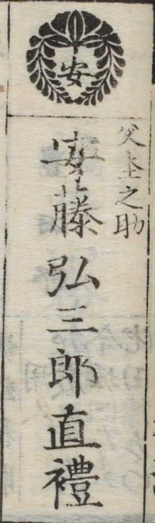 安藤直礼 2025年12月18日 あ行 『江戸切絵図』市谷/安政4年より抜粋、「安藤弘三郎」表記区画を直礼の屋敷地と推定。家禄は4535石。安藤直剛は実父。武蔵国児玉郡、那賀郡、榛澤郡、比企郡、上野国山田郡、下野国梁田郡、安蘇郡、近江国伊香郡に知行地を有する 武蔵、上野、下野、近江に知行地を有する寄合 役職通称遍歴 和暦西暦役職通称備考安政3年7月5日1856年8月5日寄合弘三郎家督元治元年寄合弘三郎 屋敷地推定 武鑑記載家紋 『昇栄武鑑』(出雲寺/元治元年)より抜粋、家紋は下り藤に安の字
