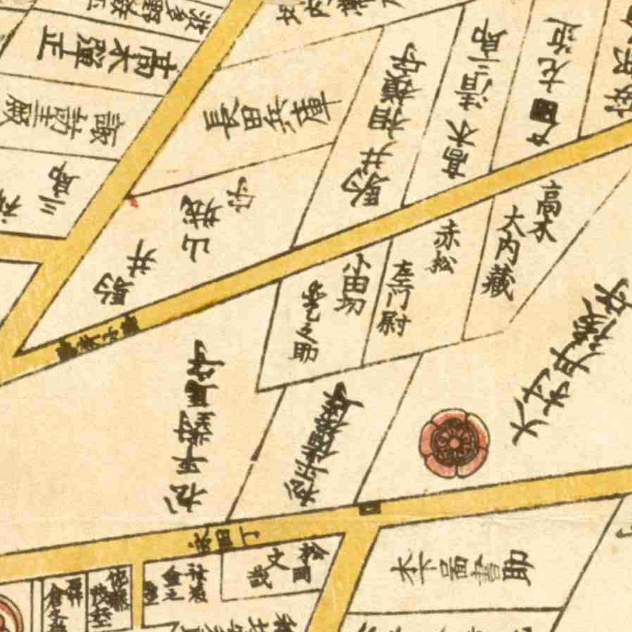 『江戸切絵図』外桜田/元治元年より抜粋、「小田切愛之助」表記区画を直道の屋敷地と推定。家禄は3500石。小田切直恭は養父。摂津国島上郡、島下郡、武蔵国橘樹郡、上総国市原郡、武射郡、長柄郡、山辺郡、下総国香取郡、豊田郡、上野国山田郡、新田郡、吾妻郡、下野国芳賀郡に知行地を有する