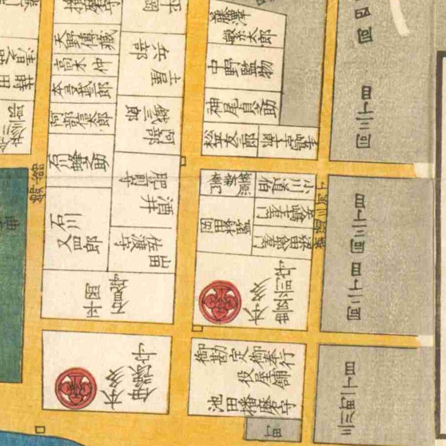 『江戸切絵図』小川町/嘉永3年より抜粋、「岡田将監」表記区画を善寶の屋敷地と推定