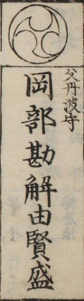 『江戸切絵図』麻布/嘉永4年より抜粋、「岡部勘解由」表記区画を賢盛の屋敷地と推定。岡部長美は実子。家禄は4500石。上総国夷隅郡、長柄郡、埴生郡、武射郡、市原郡、下総国匝瑳郡、上野国邑樂郡に知行地を有する