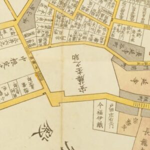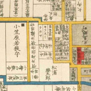 『江戸切絵図』鉄砲洲/嘉永6年(近江屋)より抜粋、「石川友之助」表記区画を総成の屋敷地と推定。家禄は4000石。三河国額田郡に知行地を有する