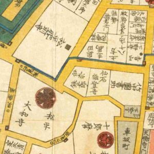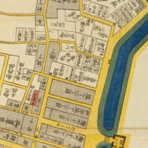 『江戸切絵図』小川町/嘉永3年より抜粋、「石河美濃守」表記区画を貞大の屋敷地と推定。家禄は4529石。石河貞明は養子。近江国蒲生郡、大和国添下郡、摂津国嶋下郡、兎原郡に知行地を有する