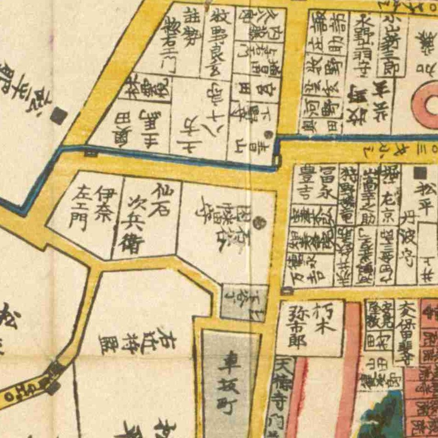 『江戸切絵図』愛宕下/万延2年より抜粋、「●石谷因幡守」表記区画を穆清の別地屋敷地(下屋敷)と推定。同区画は嘉永3年の『江戸切絵図』では「竹本圖書助」(竹中元明)表記となっている