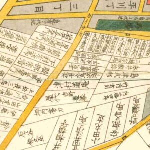 『江戸切絵図』築地/嘉永2年(国会図書館蔵)より抜粋、「秋田淡路守」表記区画を季穀の屋敷地と推定。秋田季瞱は実子。家禄は5000石。陸奥国田村郡に知行地を有する