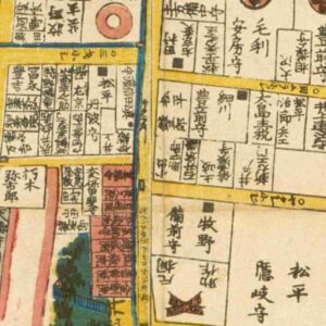 『江戸切絵図』小川町/慶応元年より抜粋、「河野豊前守」表記区画は通俰の父である河野通訓のかつての表記だが、文久3年に通俰が家督を継いでいるため、慶応元年時点では通俰の屋敷地で、表記は更新漏れと推定。家禄は2200石