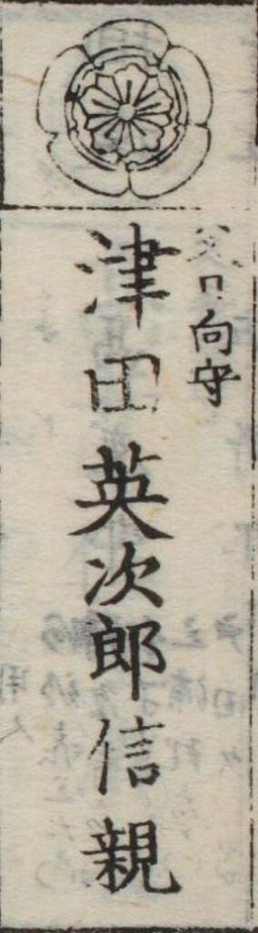 『江戸切絵図』小川町/慶応元年より抜粋、「津田栄次郎」表記区画を信親の屋敷地と推定。津田信義は実父。家禄は6000石。伊豆国那賀郡、君沢郡、安房国長狭郡、上総国武射郡、下総国香取郡に知行地を有する