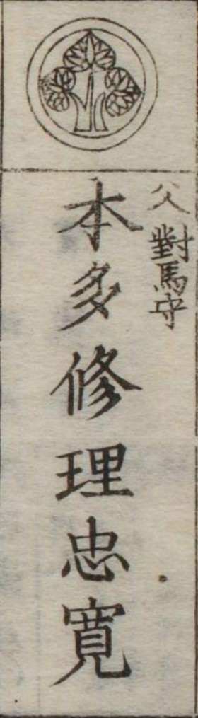 『江戸切絵図』小日向/万延元年より抜粋、「本多修理」表記区画を忠寛の屋敷地と推定。本多忠興は実父。家禄は9000石。三河国碧海郡、安房国安房郡、伊豆国加茂郡、田方郡、上総国武射郡、周淮郡に知行地を有する