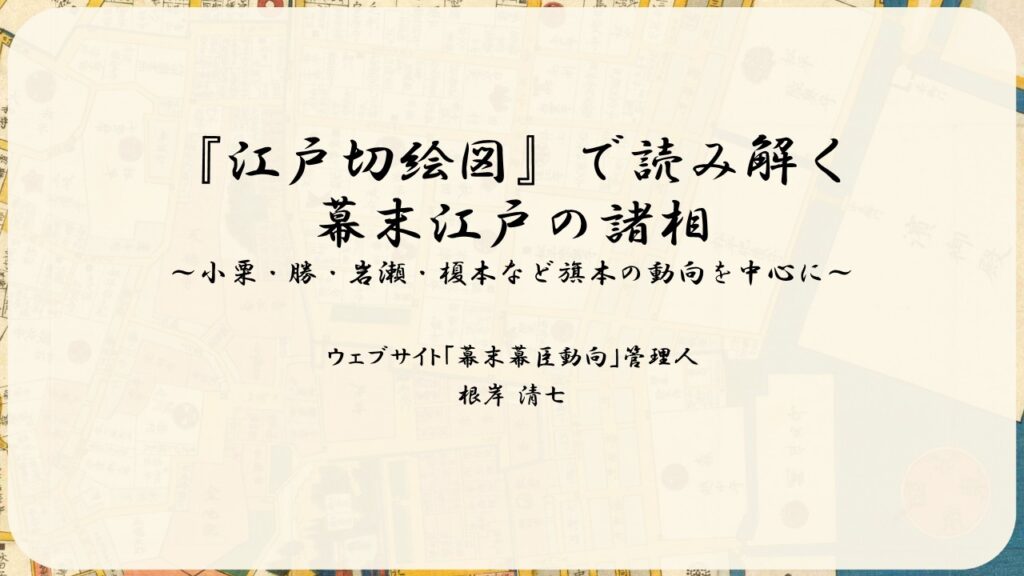 “『江戸切絵図』で読み解く幕末江戸の諸相〜小栗・勝・岩瀬・榎本など旗本の動向を中心に”と題して、約90分の講演をさせていただきました。
