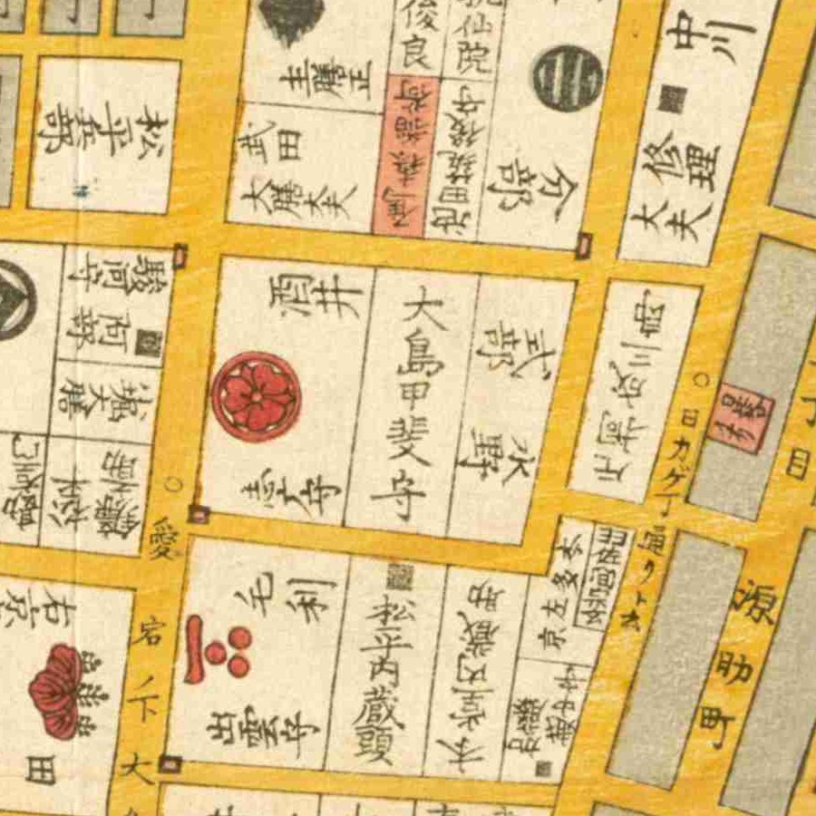 『江戸切絵図』愛宕下/嘉永3年より抜粋、「大島甲斐守」表記区画を義彬の屋敷地と推定。家禄は4700石。大島義直は実子。美濃国賀茂郡、武義郡、摂津国豊嶋郡に知行地…