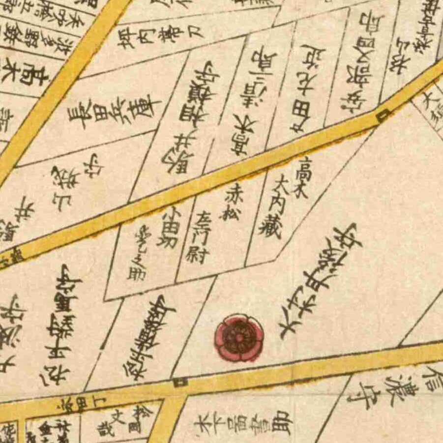 『江戸切絵図』深川/文久2年より抜粋、「神保山城守」表記区画を相徳の屋敷地と推定。家禄は6000石、大和高市郡に知行地を有する 長年番方の重鎮を務める大身旗本 …