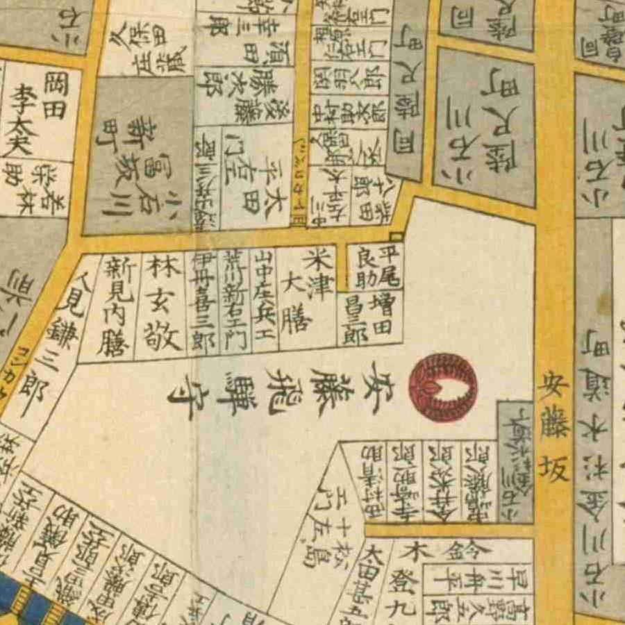 『江戸切絵図』小石川/嘉永7年より抜粋、「米津大膳」表記区画を田定の屋敷地と推定。家禄は1200石 中奥番から使番に昇進 役職通称遍歴 和暦 西暦 役職 通称 …