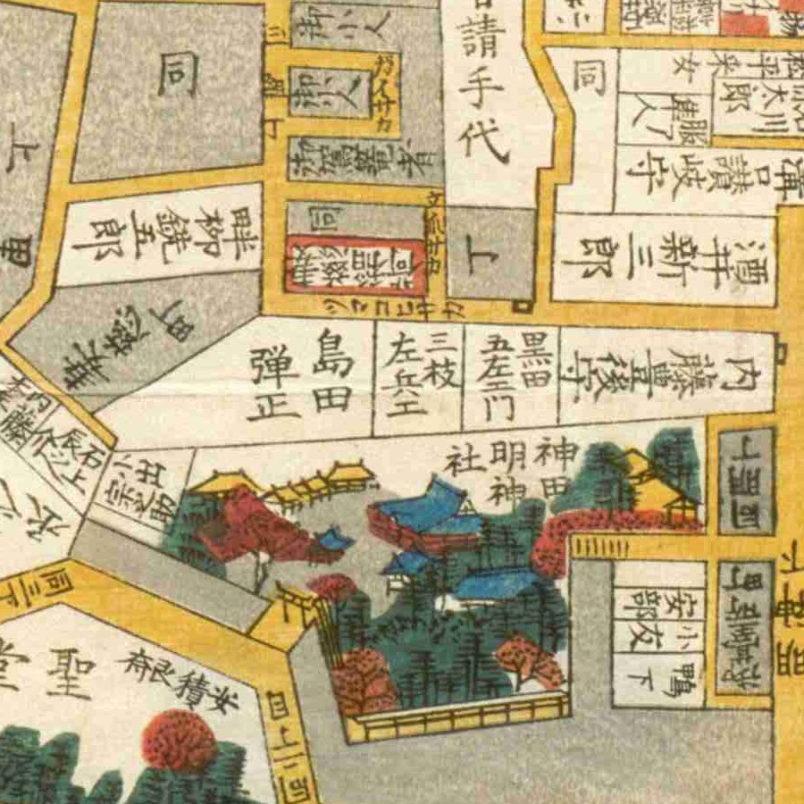 『江戸切絵図』市谷/嘉永4年(国会図書館蔵)より抜粋、「安藤杢之助」表記区画を直剛の屋敷地と推定。家禄は4535石。武蔵国児玉郡、那賀郡、榛澤郡、比企郡、上野国…