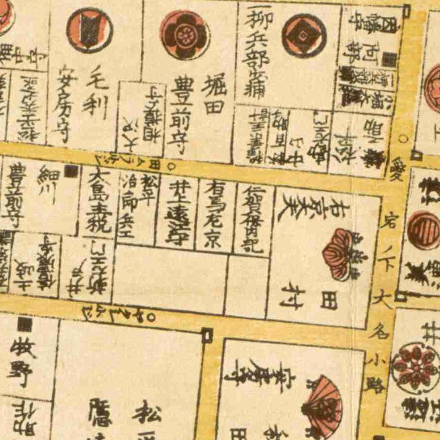 『江戸切絵図』鉄砲洲/嘉永6年(近江屋)より抜粋、「戸川内蔵助」表記区画を安行の屋敷地と推定。戸川道安は実子。家禄は3000石。備中国都宇郡に知行地を有する 本…