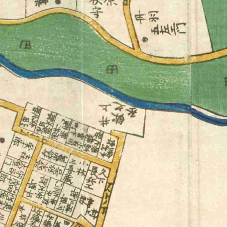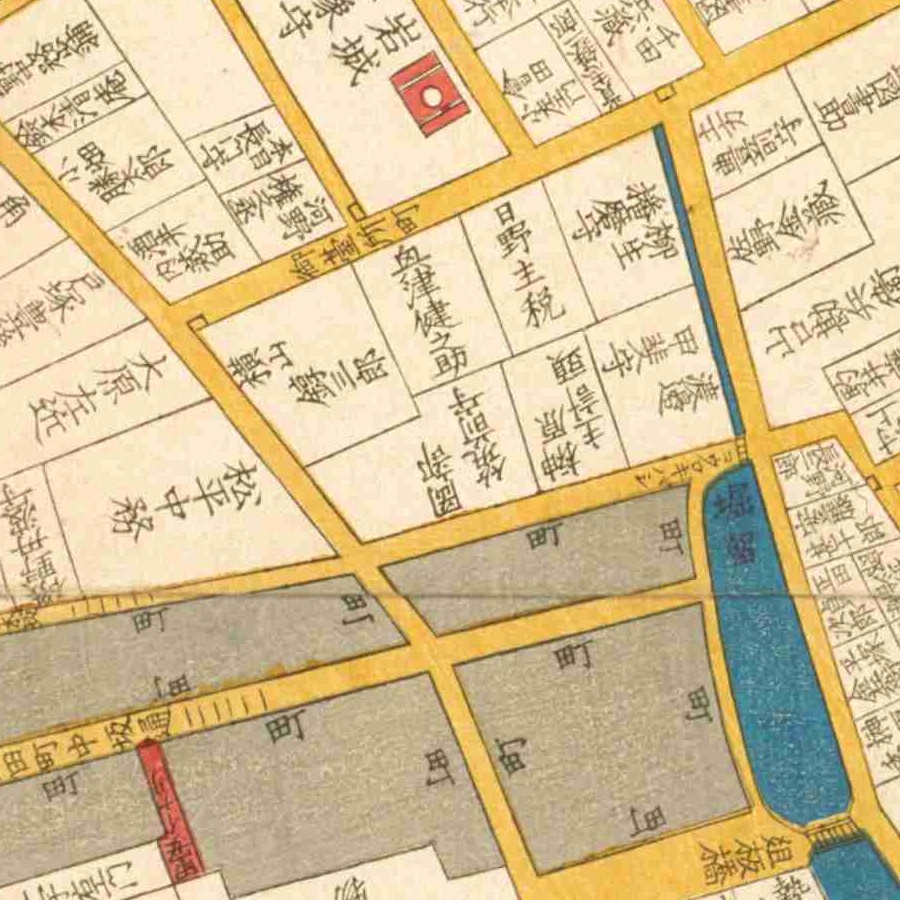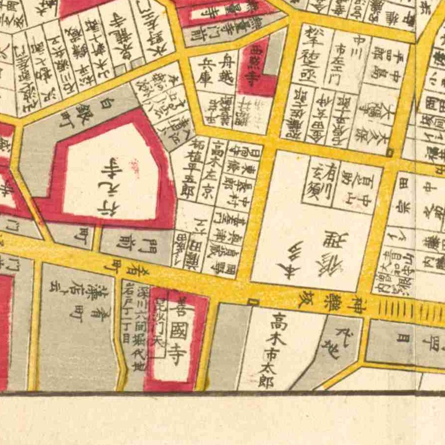 『江戸切絵図』深川/安政2年より抜粋、「小濱弾正」表記区画を継隆の屋敷地と推定。家禄は4000石。小浜鎮隆は養子。越後国蒲原郡に知行地を有する 越後に知行地を有…
