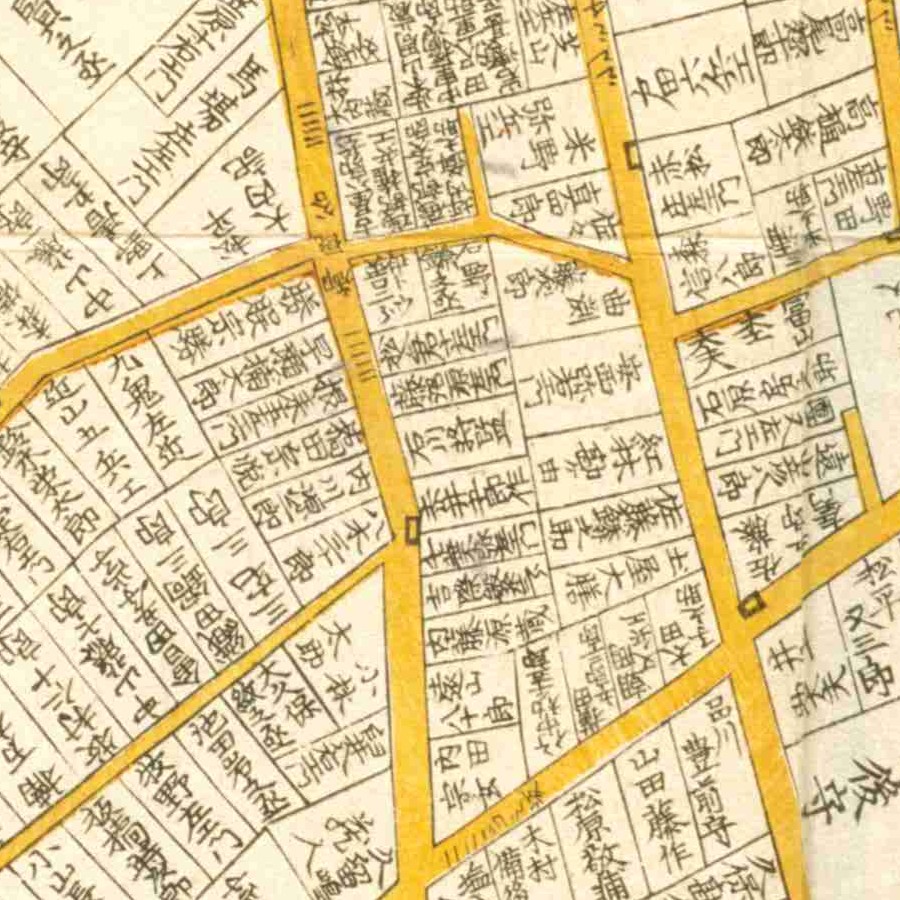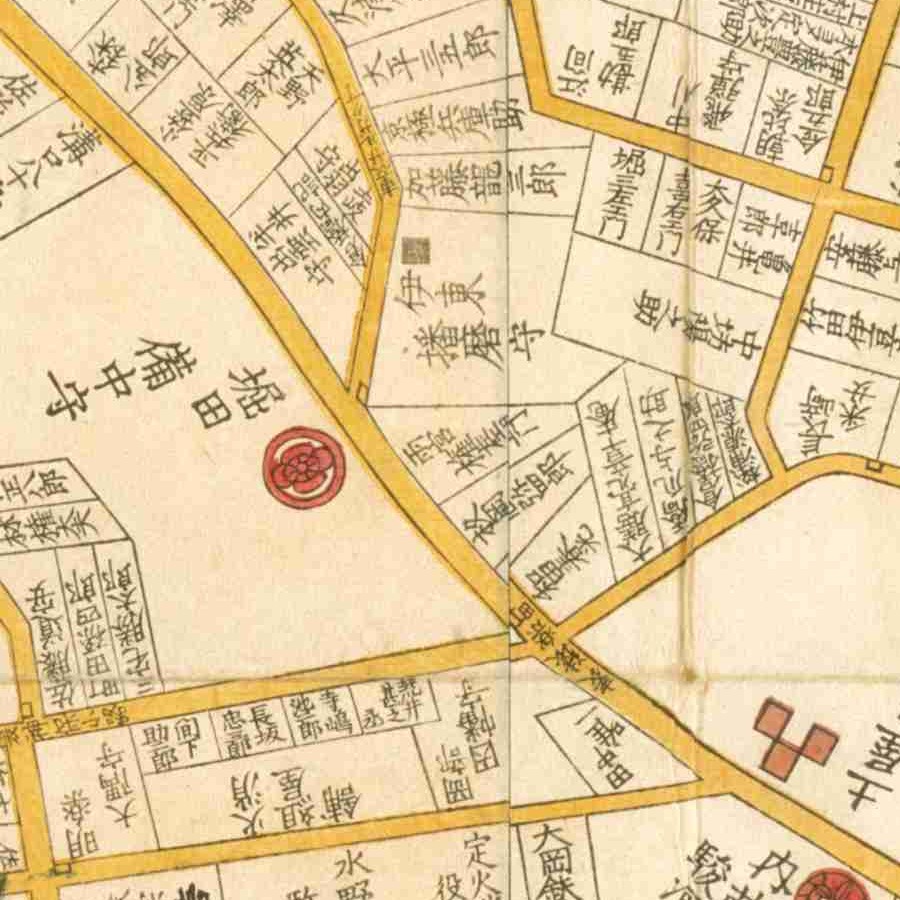 『江戸切絵図』小川町/嘉永3年より抜粋、「岡部筑前守」表記区画を長寛の屋敷地と推定。旗本期間の家禄は3000俵。和泉岸和田岡部家の内分分知。岡部長直は旗本家の後…