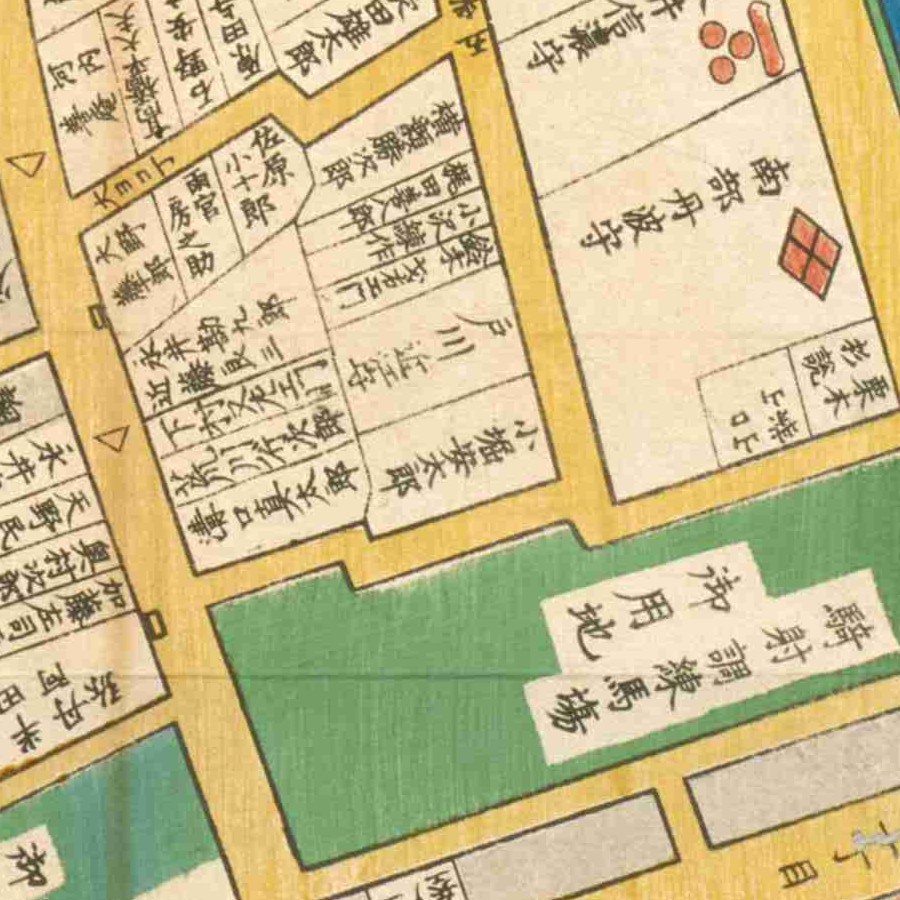 『江戸切絵図』本所/嘉永5年より抜粋、「河田栄三郎」表記区画を親愛の屋敷地と推定。家禄は1200石 本所石原町に屋敷を構える使番 役職通称遍歴 和暦 西暦 役職…