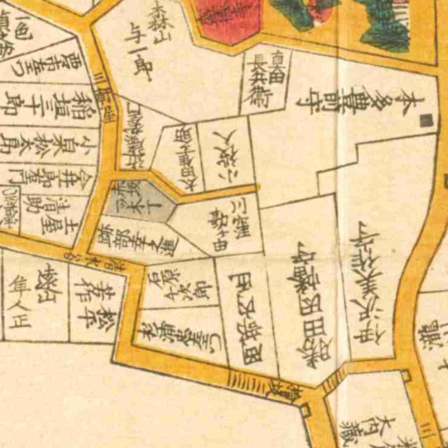 『江戸切絵図』小川町/安政7年(国土地理院蔵)より抜粋、「近藤主税」表記区画を政泰の屋敷地と推定。実際には安政6年12月に家督を養子の利三郎に譲っているが、『江…