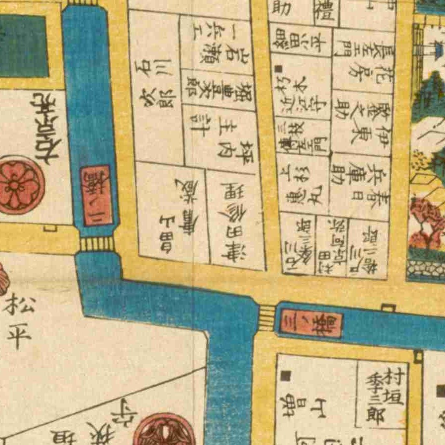 『江戸切絵図』深川/安政2年より抜粋、「土屋求馬」表記区画を常直の屋敷地と推定。家禄は3000俵。常陸土浦土屋家の内分分知 常陸土浦土屋家の分家筋の寄合 役職通…