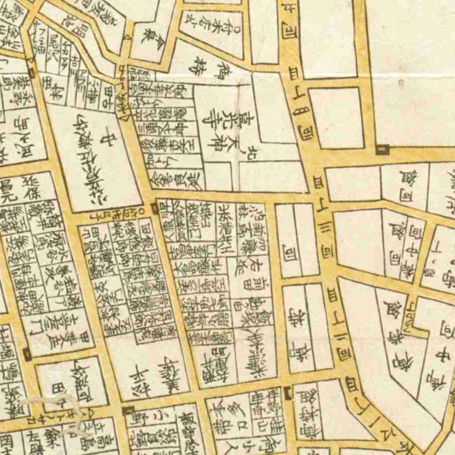 『江戸切絵図』小川町/慶応元年より抜粋、「横山錞三郎」表記区画を知哲の屋敷地と推定。家禄は4500石。下野国都賀郡に知行地を有する 下野に知行地を有する寄合 役…