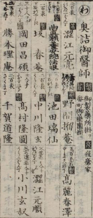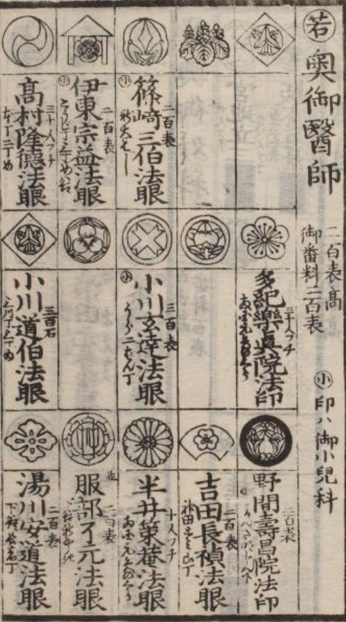 続いて「奥医師」の記載例を見てみましょう。図は嘉永2年の『大成武鑑』(出雲寺)の「奥医師」部分の抜粋となります。「奥医師」は本道(内科)、外科、鍼科、口科(歯科)、眼科に分けて記載されますが、図のように科名表記のない「奥医師」は内科(本道)を意味します。小児科についても、丸に小の字の記号で識別できる形で、本道(内科)に含めて記載されていることがわかります。「奥医師」に任命されると原則として「法印」「法眼」などに任じられますが、これらは人名表記内の通称の後に記載が確認できます。「多紀樂眞院法印」や「野間壽昌院法印」のような「法印」の通称が「院号」となっていることも確認できます。