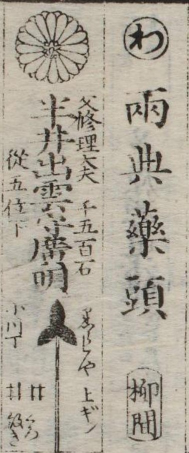 このうち席次が最上位の「典薬頭」についてみてみます。なぜか「奥医師」などより後の掲載になりますが、表記法については、図の安政2年の『安政武鑑』(須原屋)の抜粋のように、幕医で唯一、諱の「廣明」まで表記が確認できます。また「典薬頭」は他の「幕医」のような「法眼」や「法印」ではなく、一般の旗本と同様の「諸大夫」に叙任されることが「出雲守」と「従五位下」の表記から確認できます。さらに家紋とともに記載されるのは幕医の中では「典薬頭」と次に紹介する「奥医師」のみとなります。
