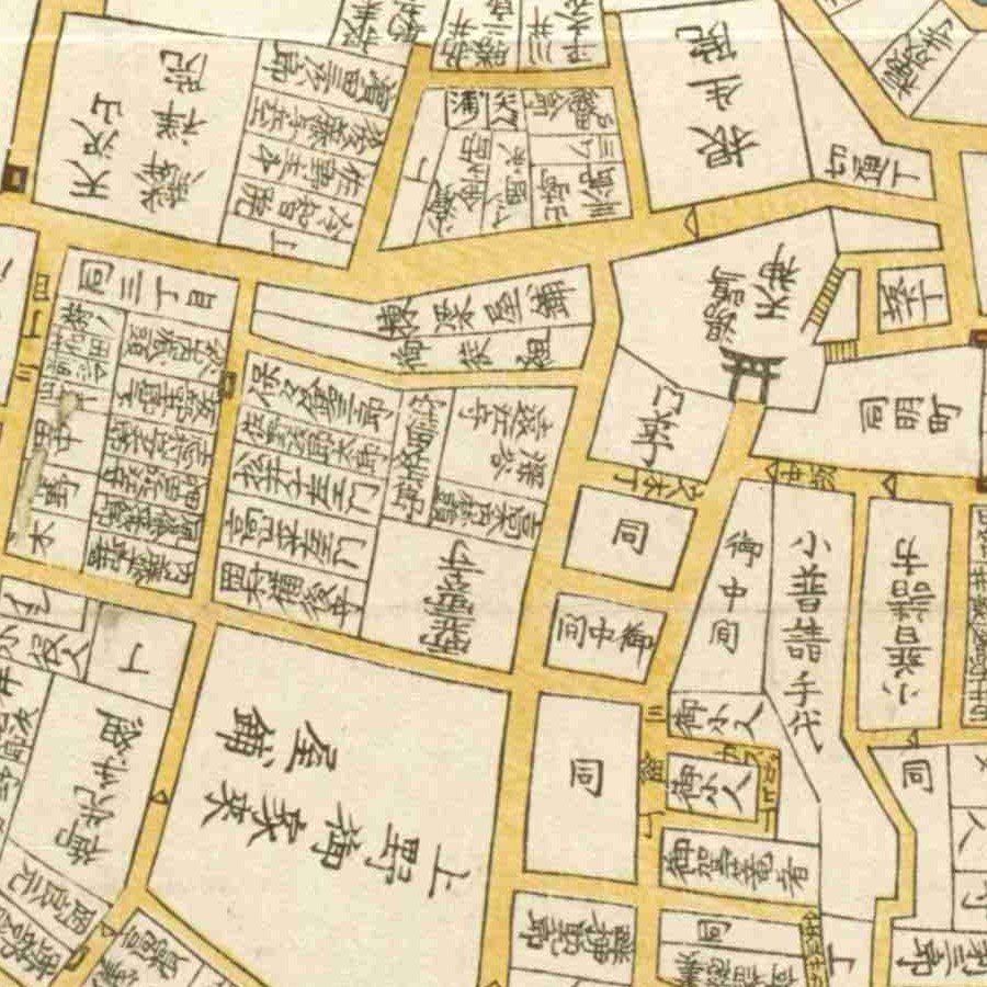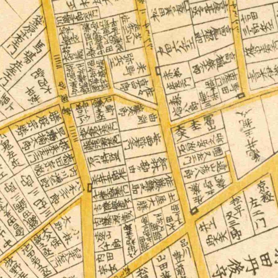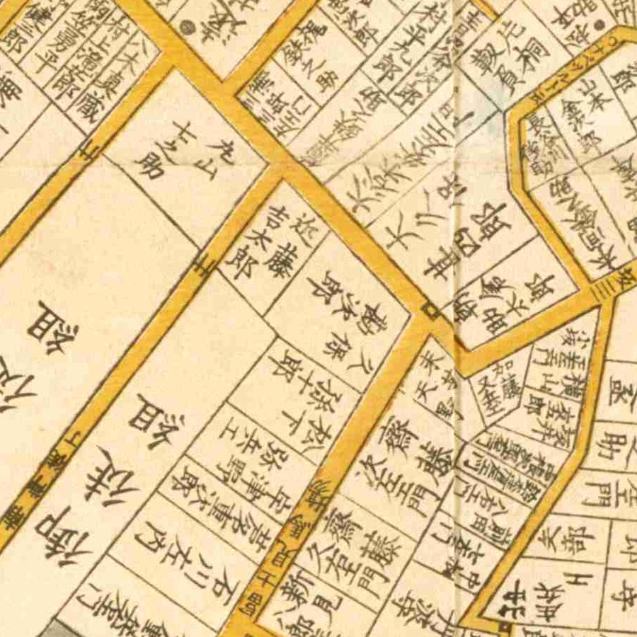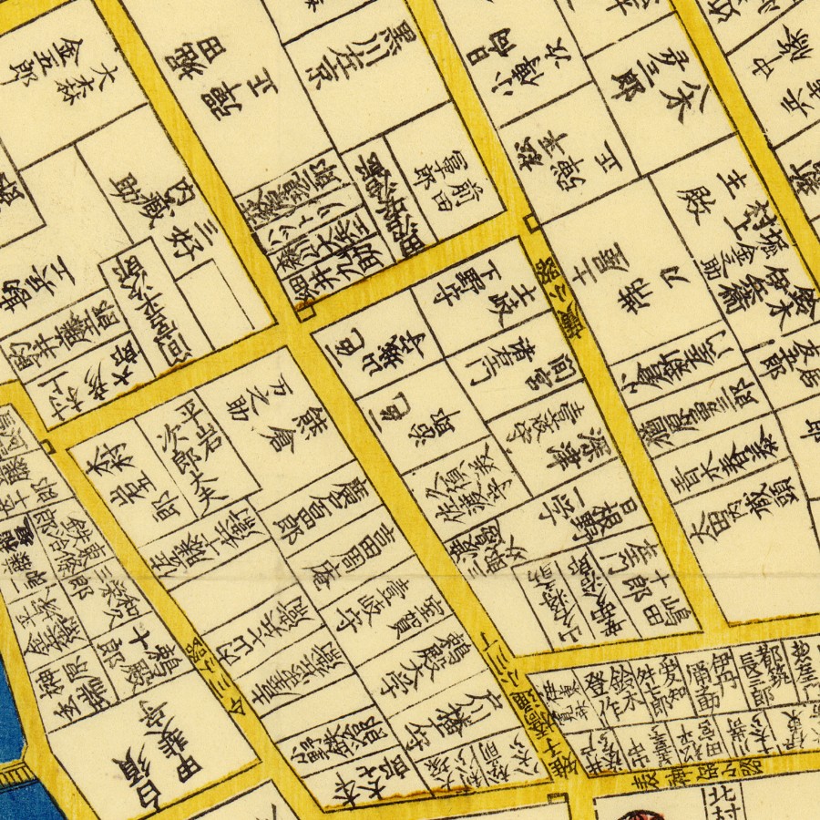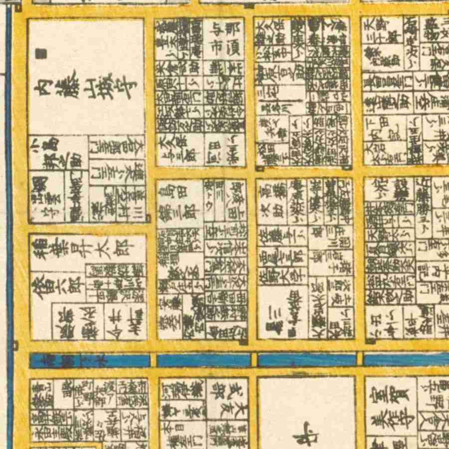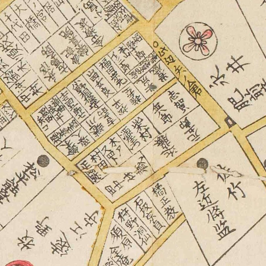 『江戸切絵図』小川町/安政7年(国土地理院蔵)より抜粋、「一色治郎」表記区画を直記の屋敷と推定。一色直休は実父。家禄は3500石。三河国宝飯郡、設楽郡、賀茂郡に…
