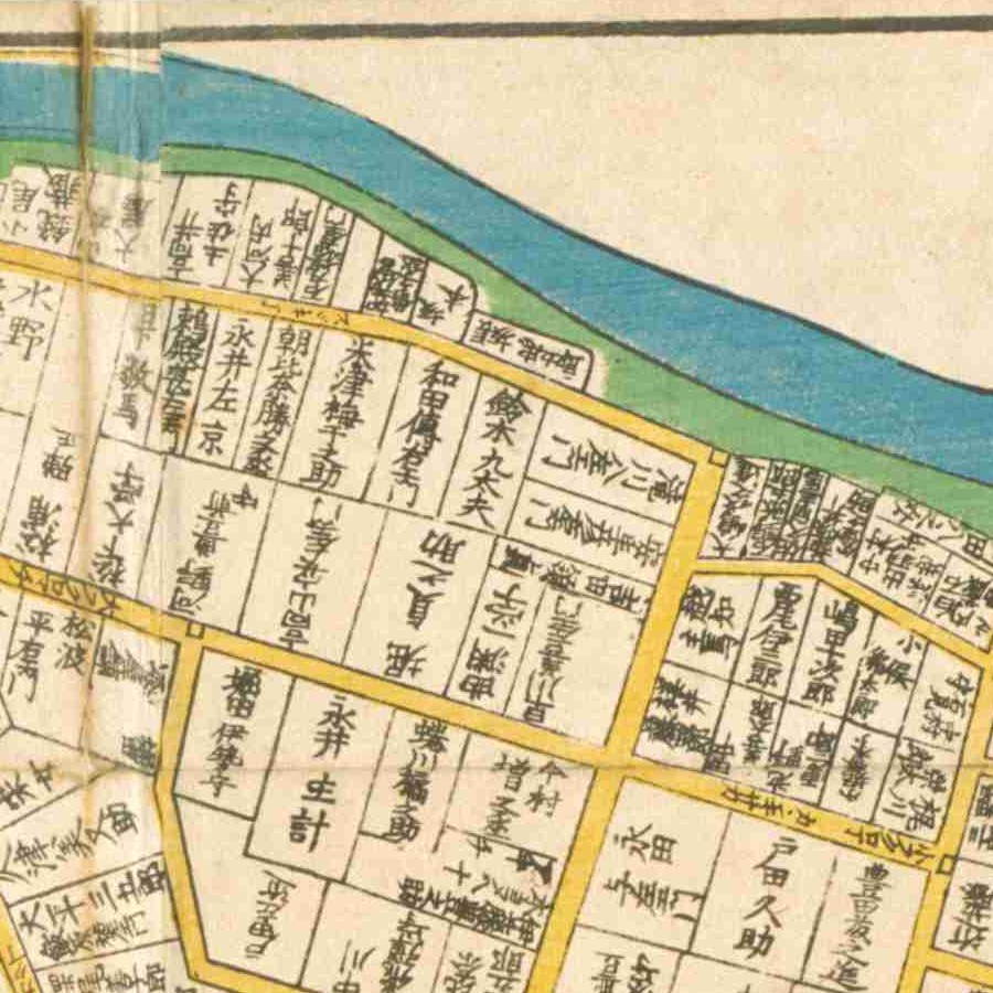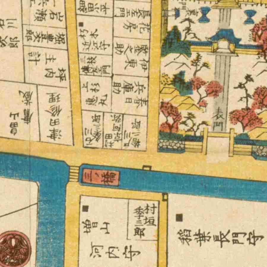 『江戸切絵図』鉄砲洲/文久元年より抜粋、「戸川捨二郎」表記区画を道安の屋敷地と推定。家禄は3000石。備中国都宇郡に知行地を有する 備中に知行地を有する寄合 役…