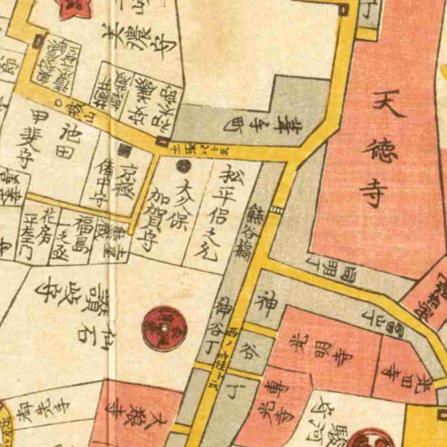 『江戸切絵図』本郷/万延2年より抜粋、「近藤登之助」表記区画を利用の屋敷地と推定。近藤致用は実父。家禄は5450石。遠江国引佐郡、長上郡、豊田郡、相模国大住郡、…
