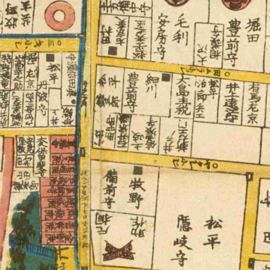 『江戸切絵図』愛宕下/嘉永3年より抜粋、「松平侶之允」表記区画を定正の屋敷地と推定。久松松平家。松平勝雅は後継。家禄は5000石。下野国芳賀郡に知行地を有する …