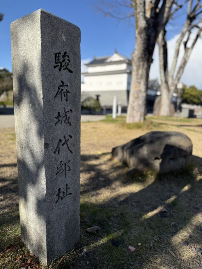 駿府城代邸址の碑。奥に見えているのが駿府城の巽櫓。駿河大納言こと徳川忠長が寛永9年(1632年)に改易されてから幕末まで、駿府城は幕府直轄となり、幕府から駿府城の管理責任者として駿河城代が派遣され、統治されました。