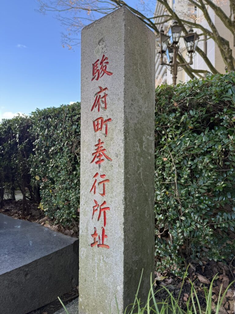 静岡市役所の脇にある駿府町奉行所址の碑。駿府町奉行所は駿府城の大手門の南側に位置しました