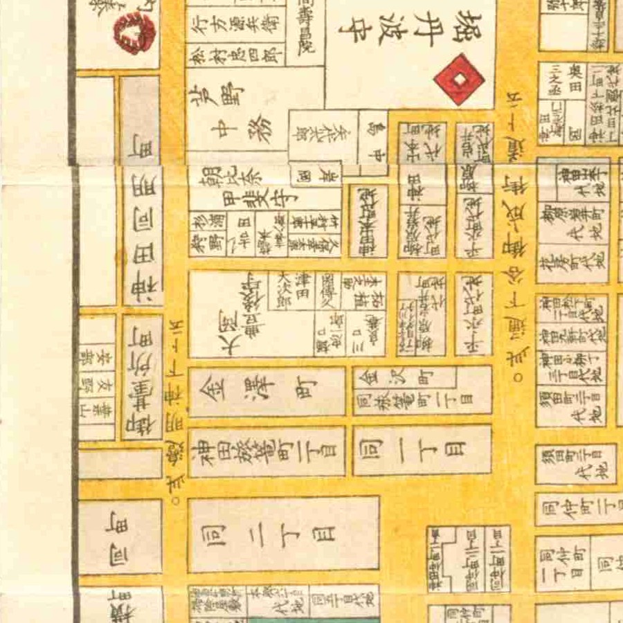 『江戸切絵図』小川町/嘉永3年より抜粋、「駒木根大内記」表記区画を政暁の屋敷地と推定。駒木根政邦は嫡孫。家禄は1700石→2000石 番方から側衆まで躍進 役職…