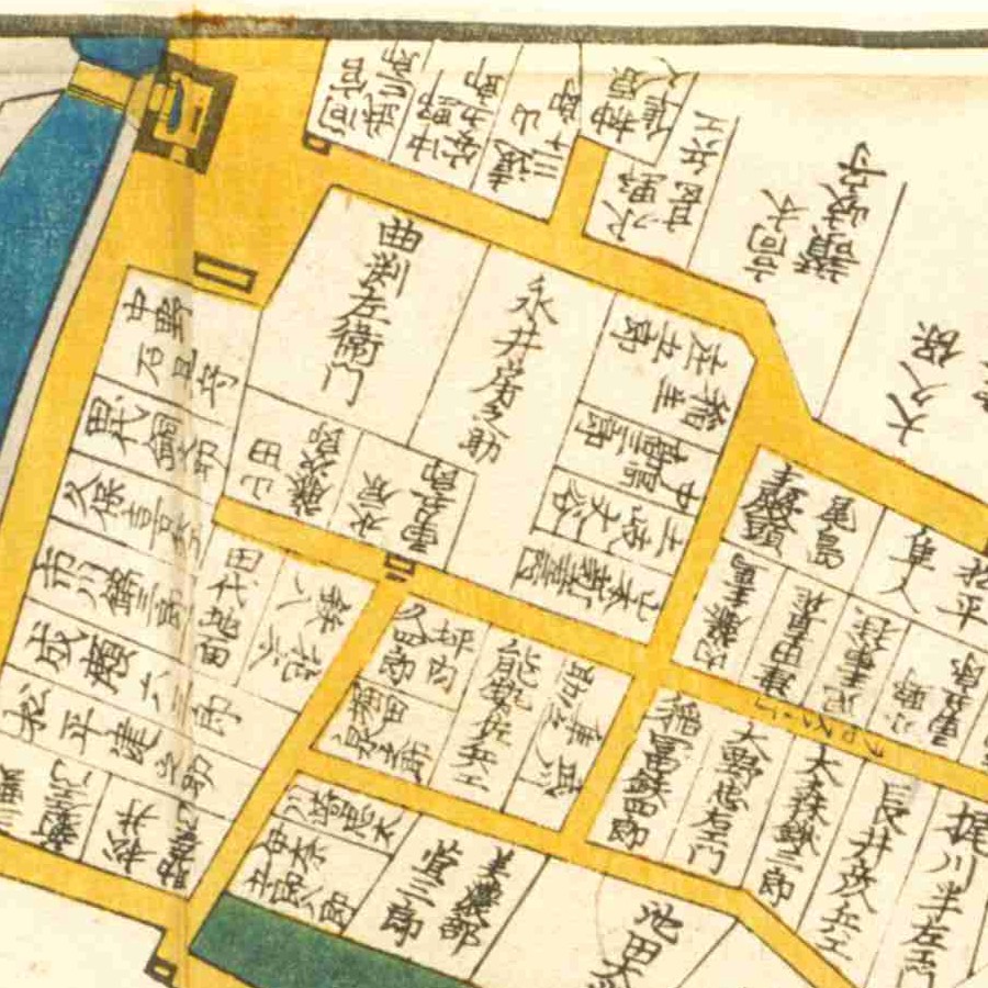 『江戸切絵図』外桜田/元治元年より抜粋、「永井兼之助」表記区画を直景の屋敷地と推定。家禄は3400石。武蔵国埼玉郡、上総国市原郡、長柄郡に知行地を有する 火事場…
