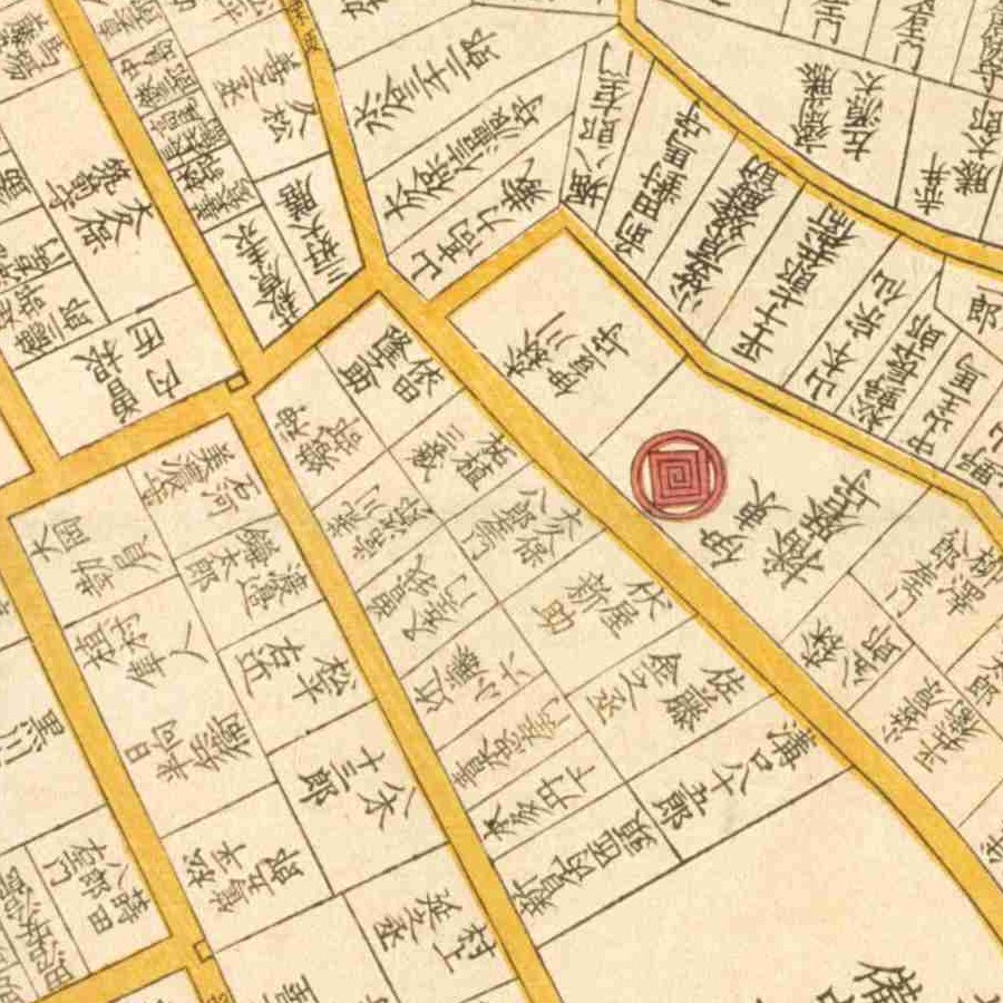 『江戸切絵図』鉄砲洲/嘉永6年より抜粋、「新庄長門守」表記区画を直容の屋敷地と推定。新庄直敬は嫡孫。家禄は3000石。常陸国行方郡、信太郡、新治郡、河内郡、下野…