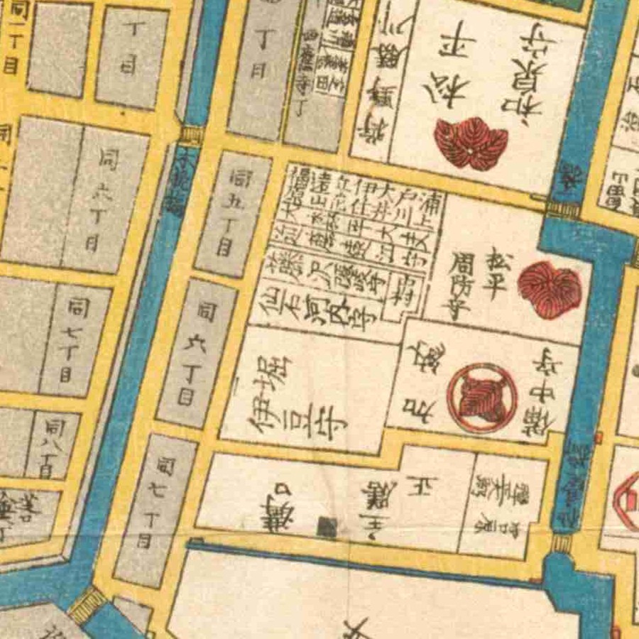 『江戸切絵図』築地/嘉永2年(国会図書館蔵)より抜粋、「秋田淡路守」表記区画を季穀の屋敷地と推定。秋田季瞱は実子。家禄は5000石。陸奥国田村郡に知行地を有する…